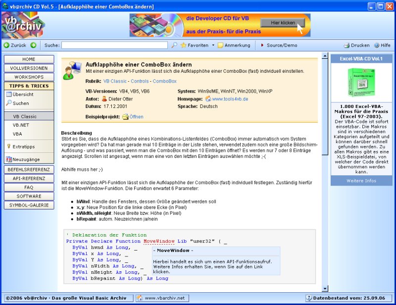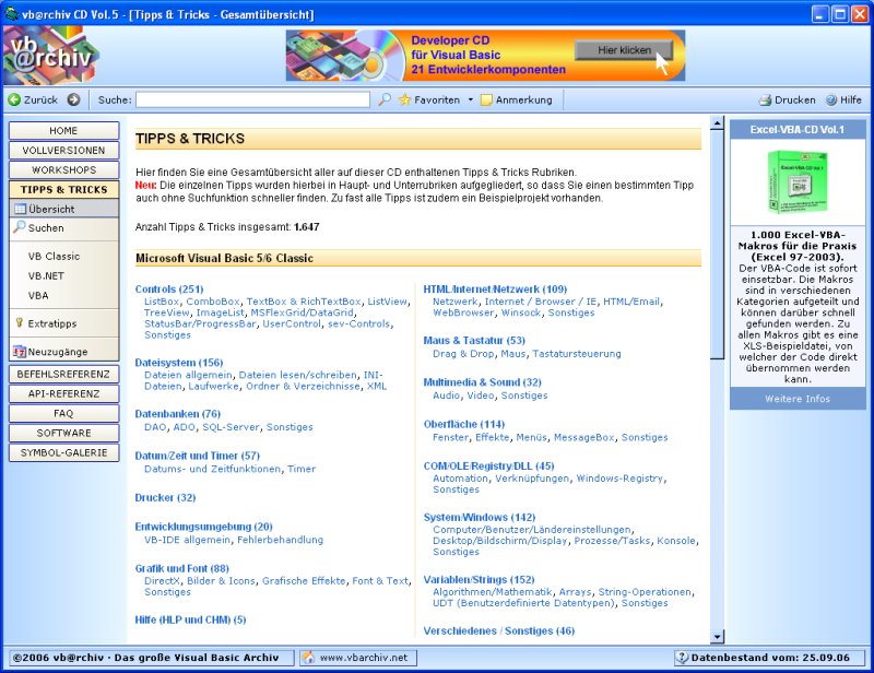 HOME WORKSHOPS TIPPS & TRICKS BEFEHLSREFERENZ API-REFERENZ FAQ DOWNLOAD TOOLBESPRECHUNG BÜCHERECKE MARKETPLACE GRAFIK & DESIGN VB-SEITEN